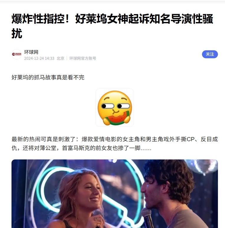 尤为关键的是,巴尔多尼关联的制作公司Wayfarer Studios被指深度参与诽谤策略制定,从内容生产到舆论引导形成闭环操作,暴露出资本如何介入并扭曲职场纠纷的本质,使之演变为一场信息战。